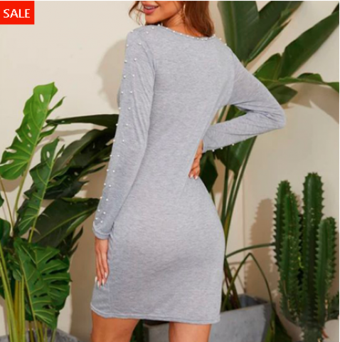 Introducing our stunning gray pearl party mini dress for women. Made with high-quality polyester, this dress features long sleeves and a round neckline. Perfect for special occasions, this dress is designed to make you look fabulous. Its solid color and mini length add a touch of elegance. Whether it's a party or a celebration, this dress will surely make you stand out. Solve your outfit woes with this gorgeous dress!