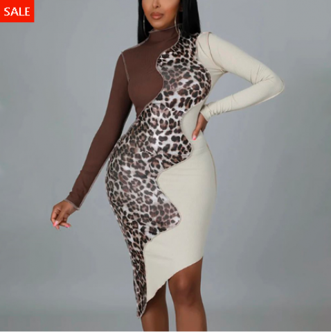 Leopard Print High Neck Bodycon Dress Perfect for Club & Night Out! Long Sleeves